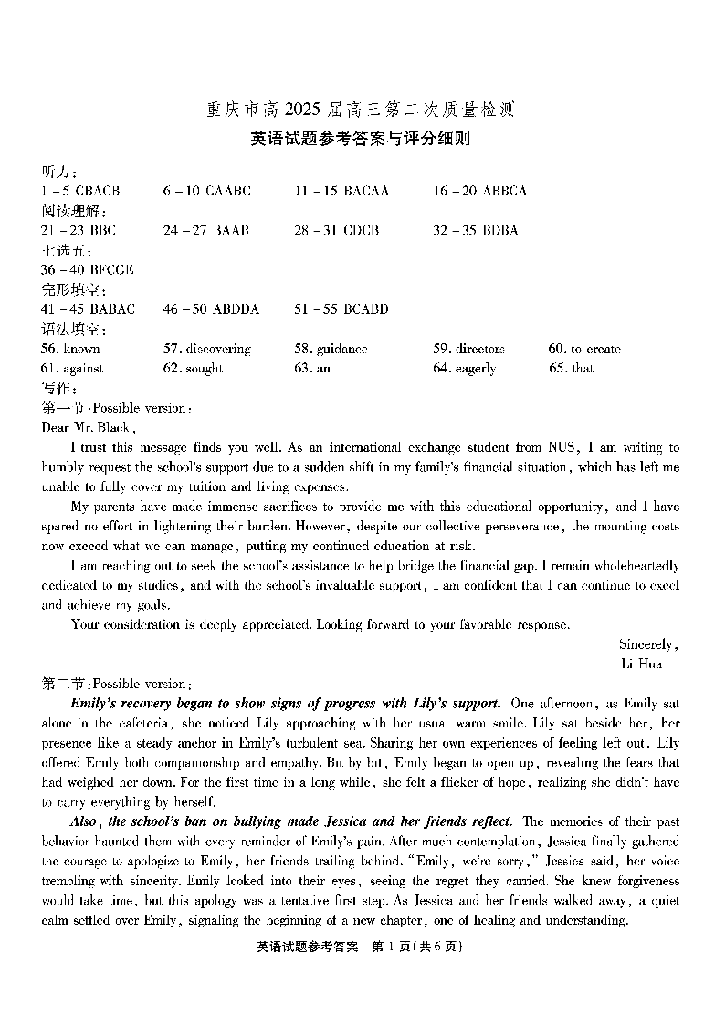 重庆市南开中学2025届高三第二次质量检测英语答案