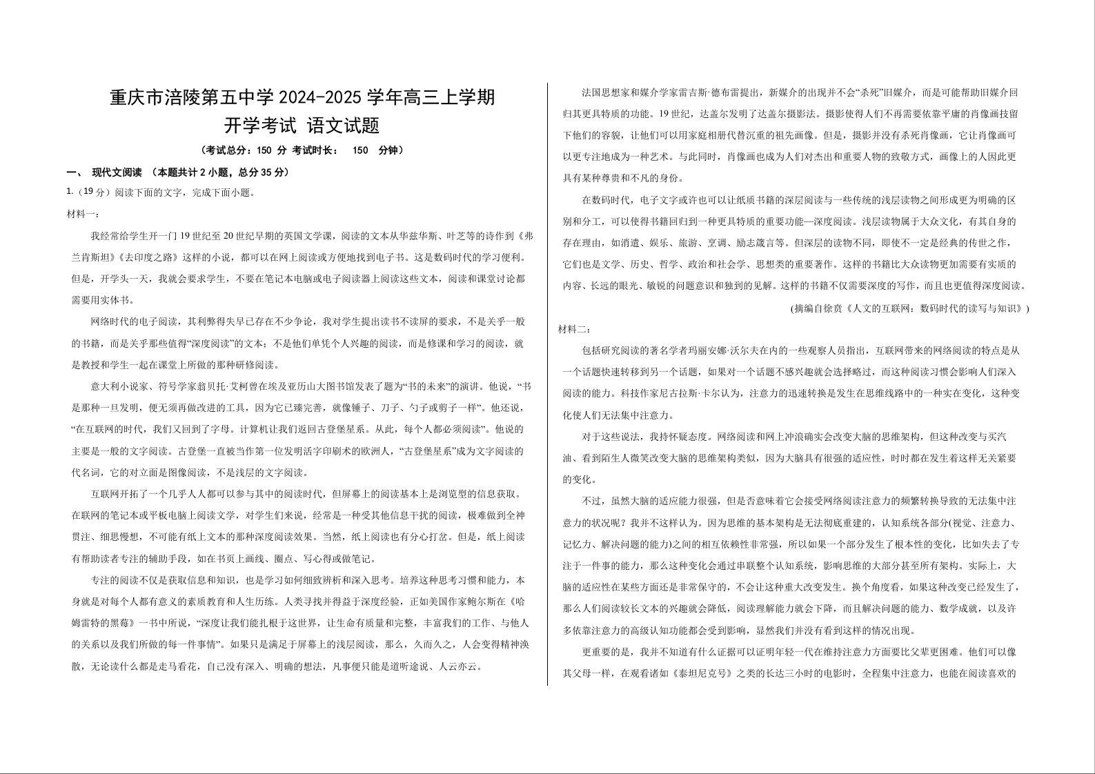 重庆市涪陵第五中学2025届高三上学期开学考试语文+答案