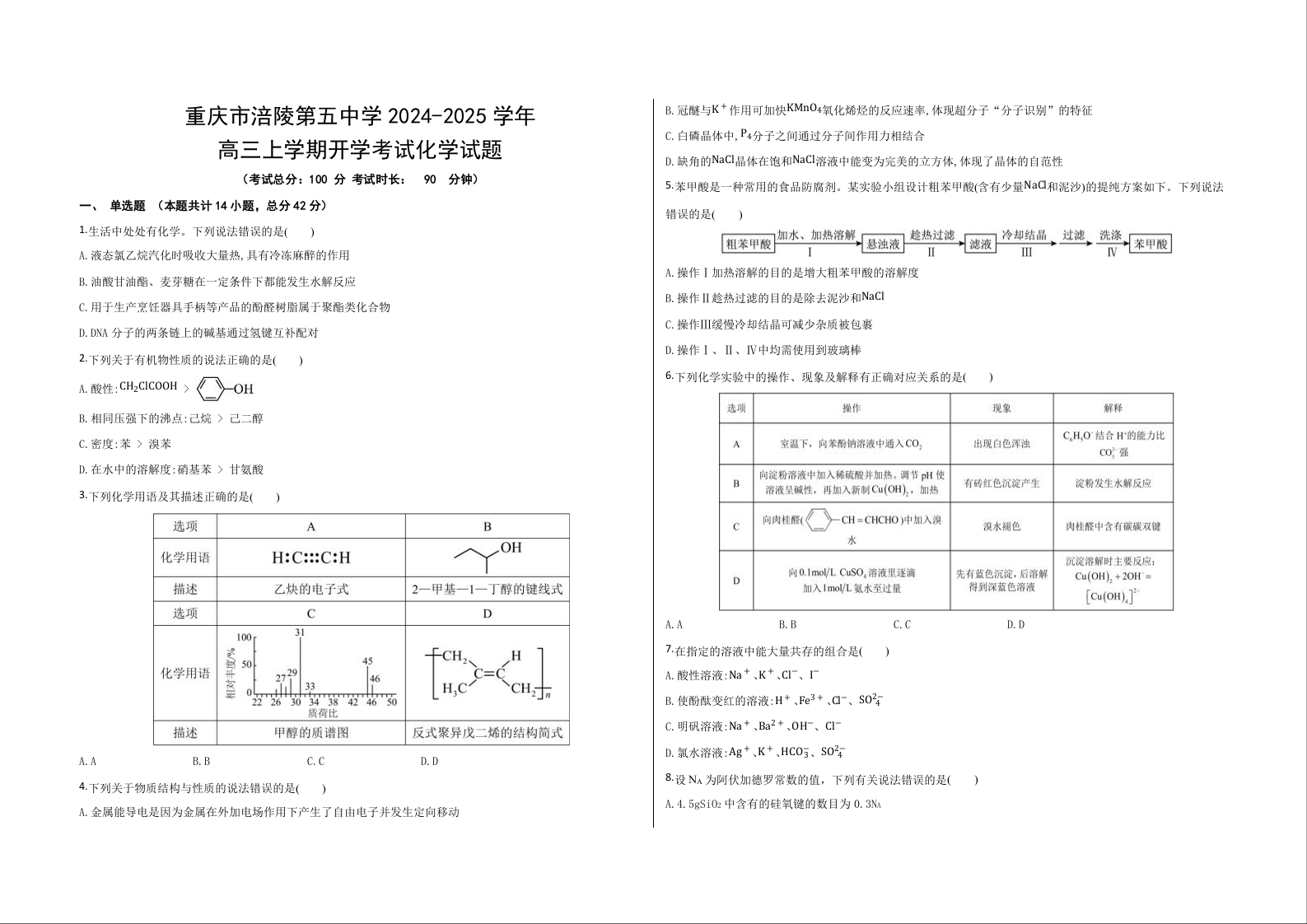 重庆市涪陵第五中学2025届高三上学期开学考试化学+答案
