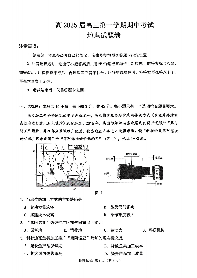 重庆市主城五区高2025届高三第一学期期中考试地理