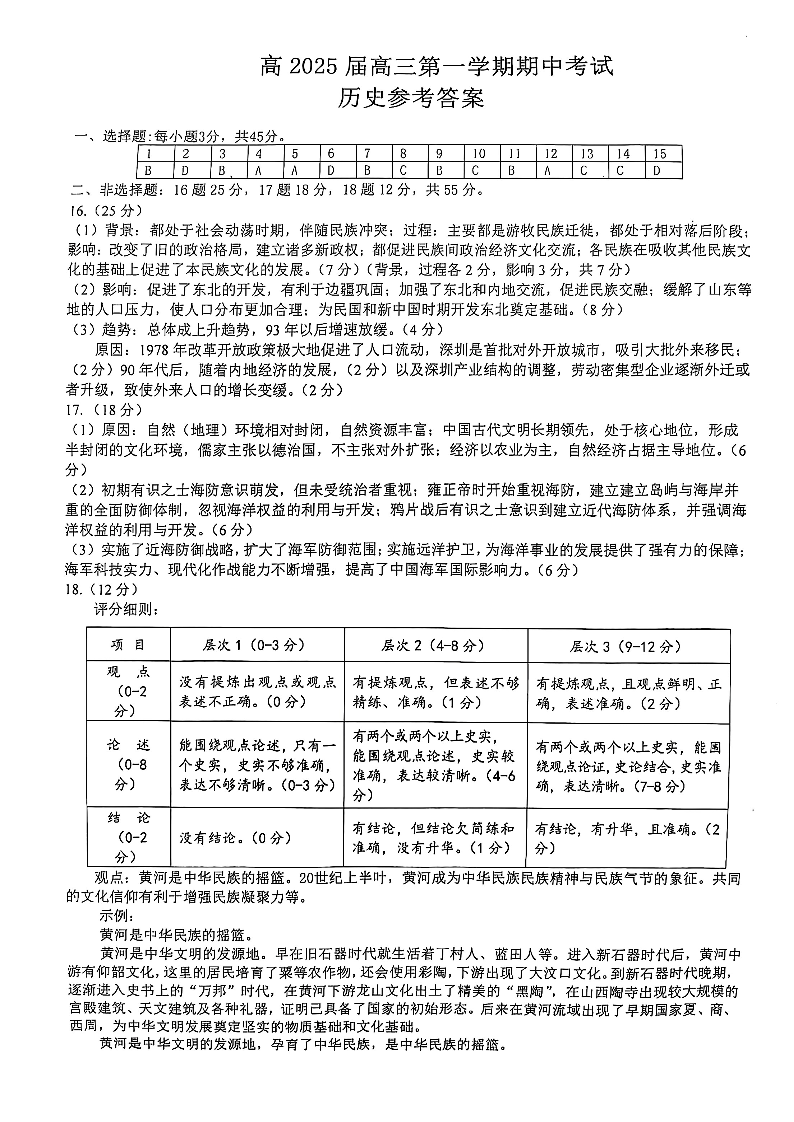 重庆市主城五区高2025届高三第一学期期中考试历史答案