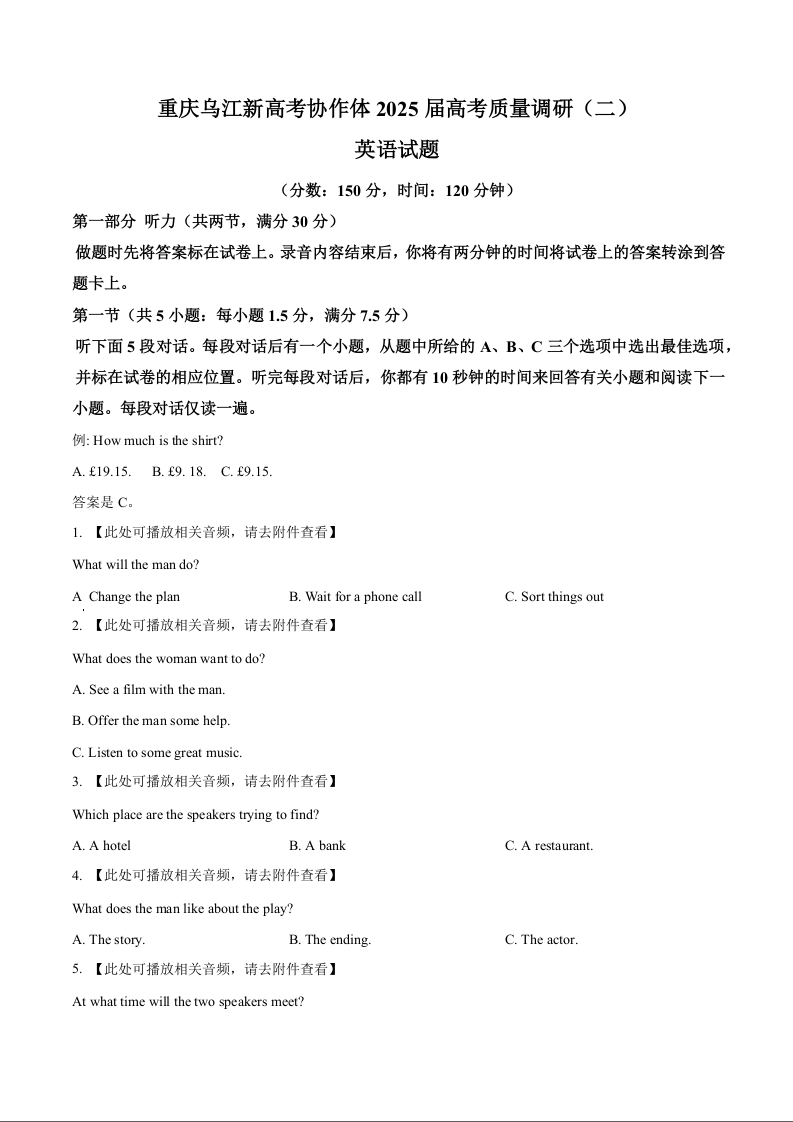 重庆乌江新高考协作体2025届高考质量调研(二)英语试题
