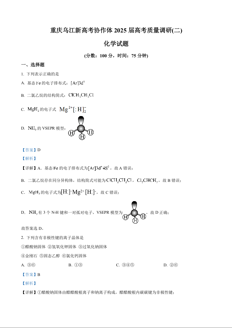 重庆乌江新高考协作体2025届高考质量调研(二)化学试题 Word版含解析