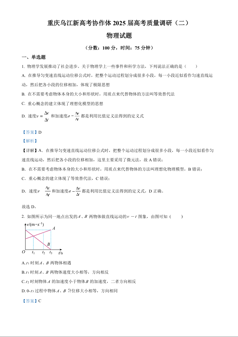 重庆乌江新高考协作体2025届高考质量调研(二)物理试题 Word版含解析