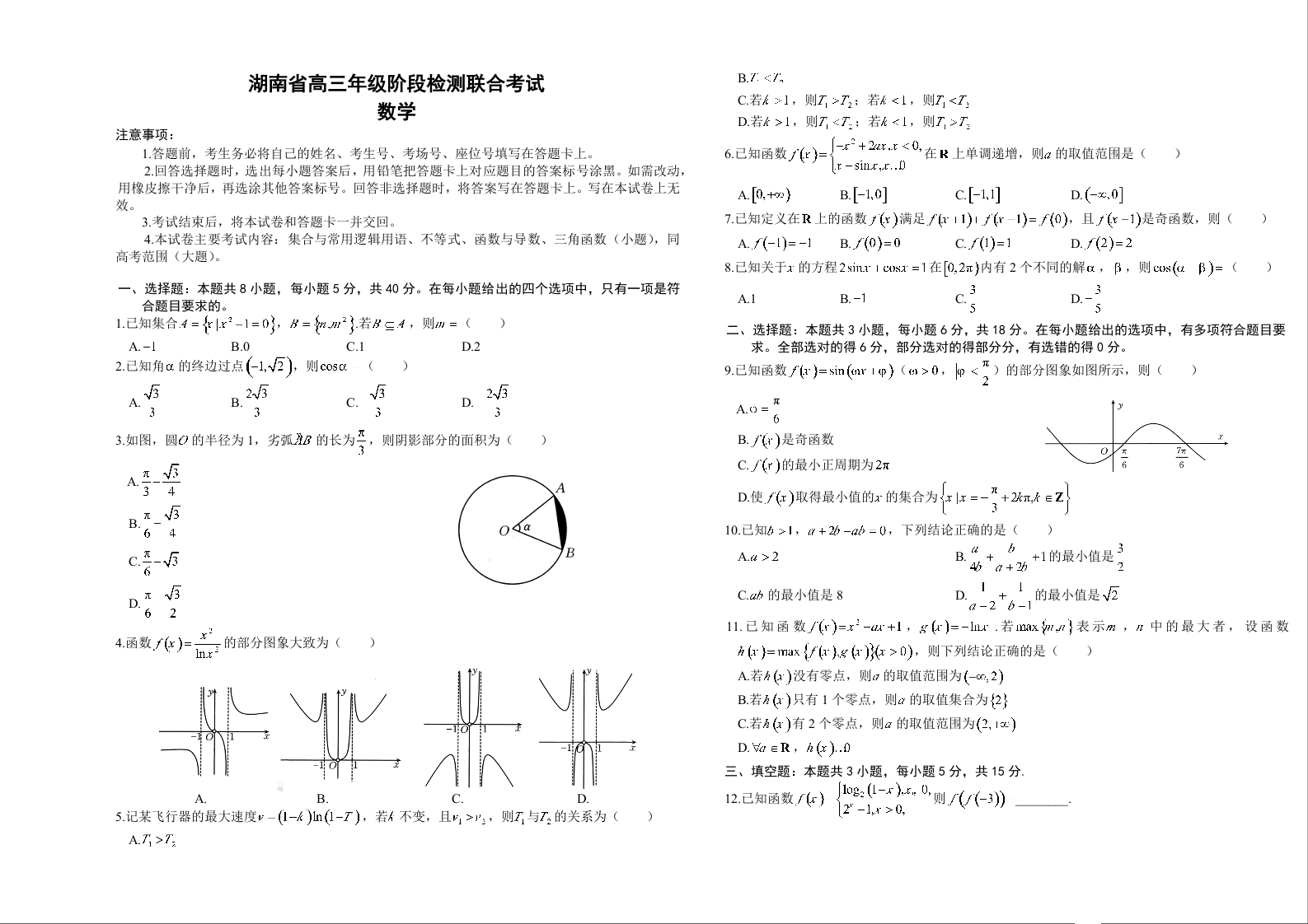 湖南省部分高中2025届高三年级阶段检测联合考试数学试题