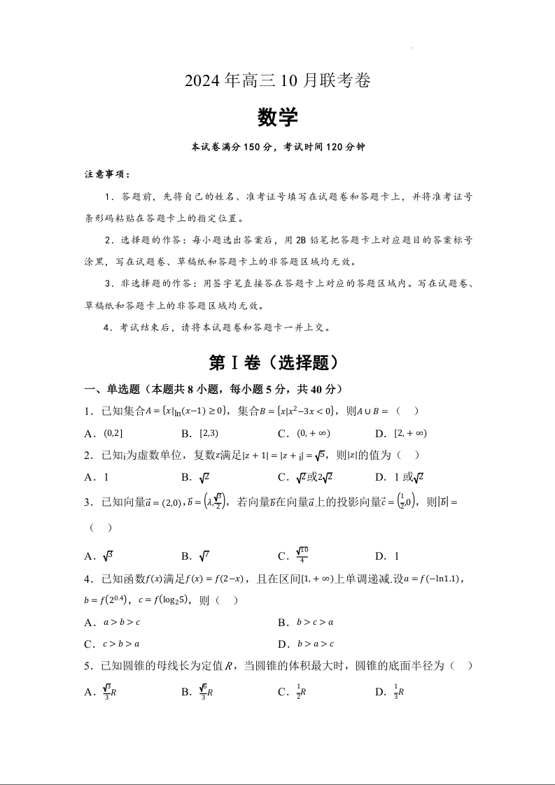 湖南省部分名校2025届高三上学期10月联考试题数学+答案