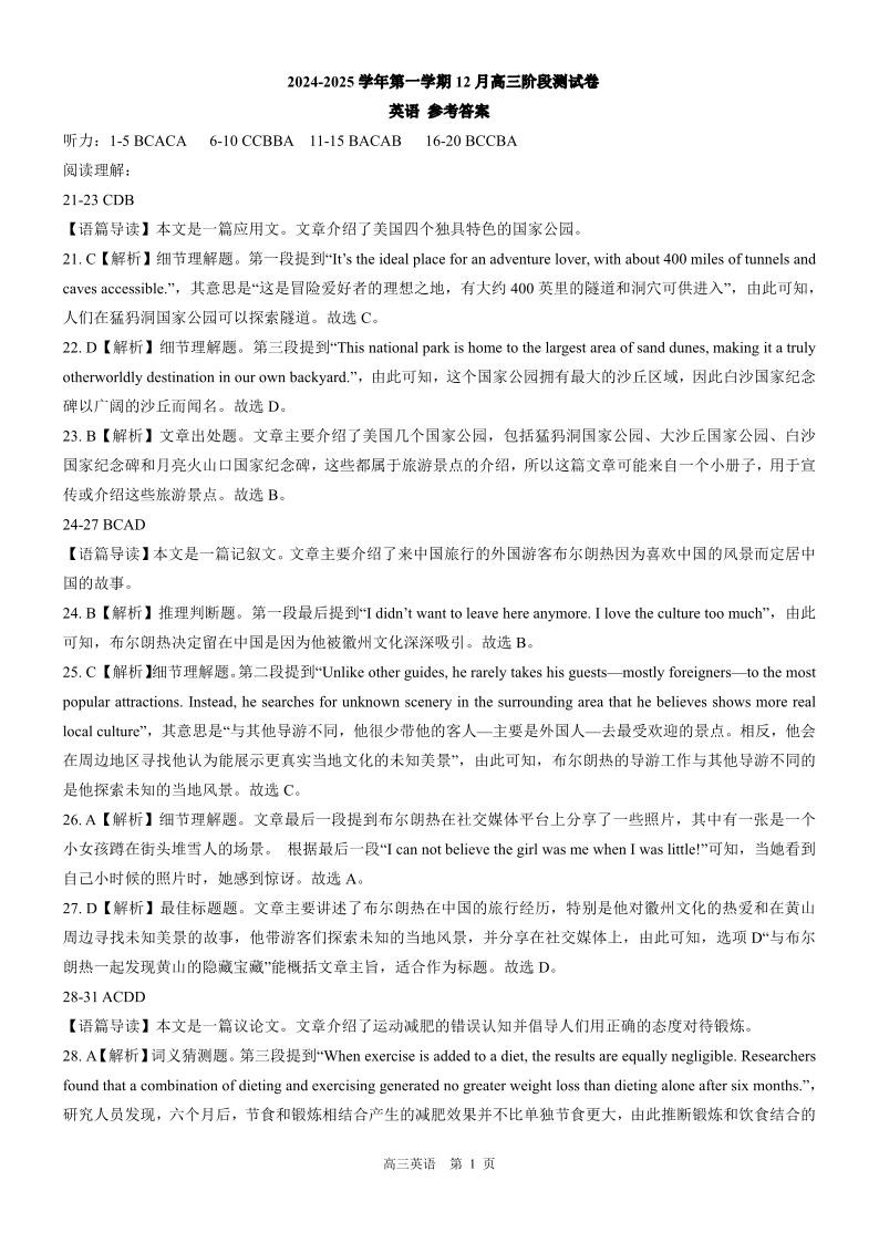 河北省部分学校2024—2025学年高三上学期12月阶段性测试英语答案
