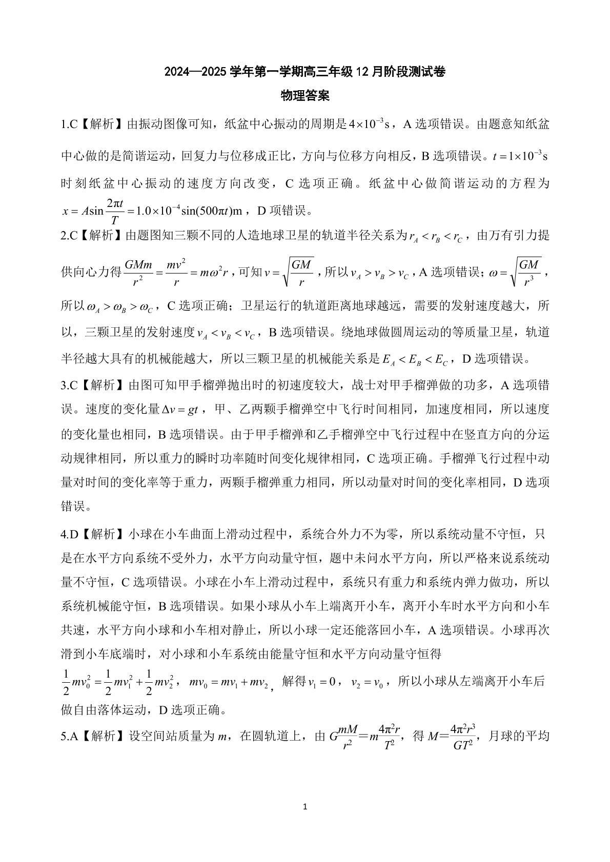 河北省部分学校2024—2025学年高三上学期12月阶段性测试物理答案