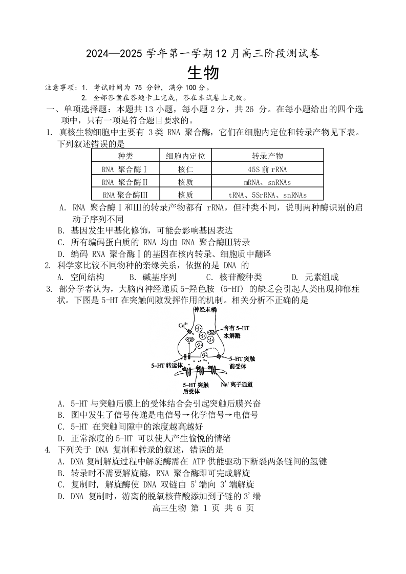 河北省部分学校2024—2025学年高三上学期12月阶段性测试生物