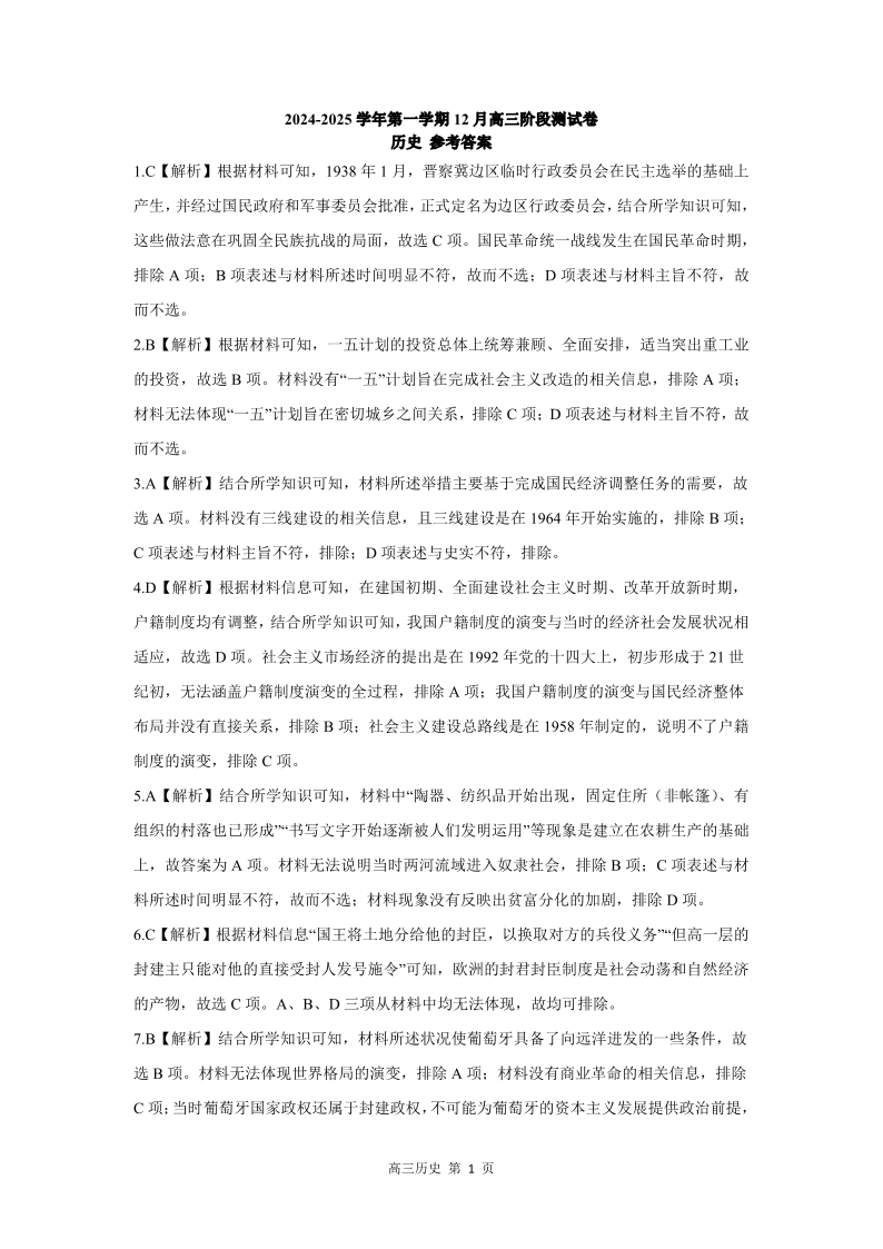 河北省部分学校2024—2025学年高三上学期12月阶段性测试历史答案