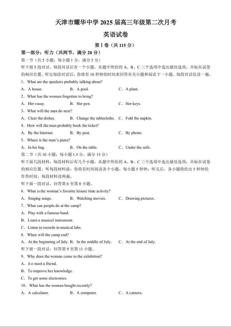 天津市耀华中学2025届高三上学期第二次月考英语含答案