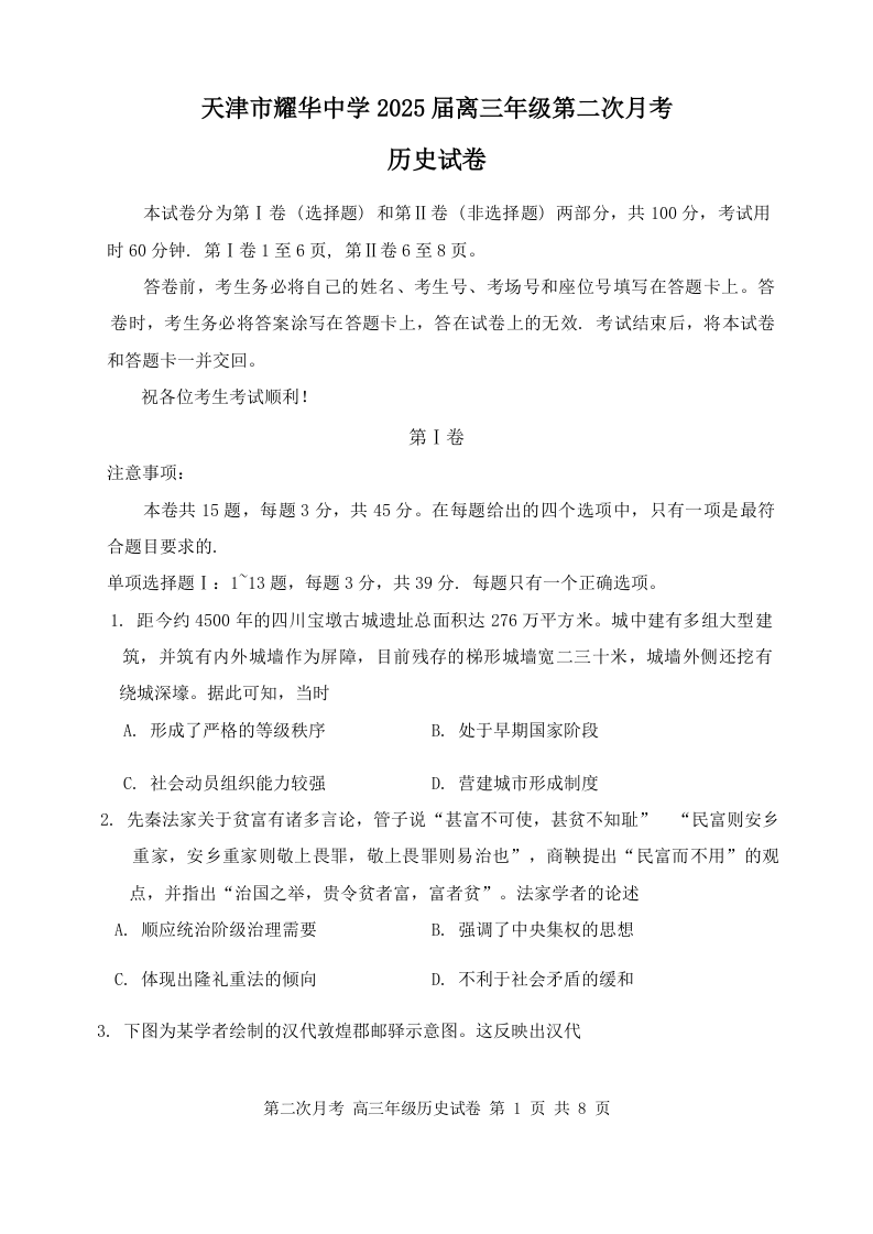 天津市耀华中学2025届高三上学期第二次月考历史含答案