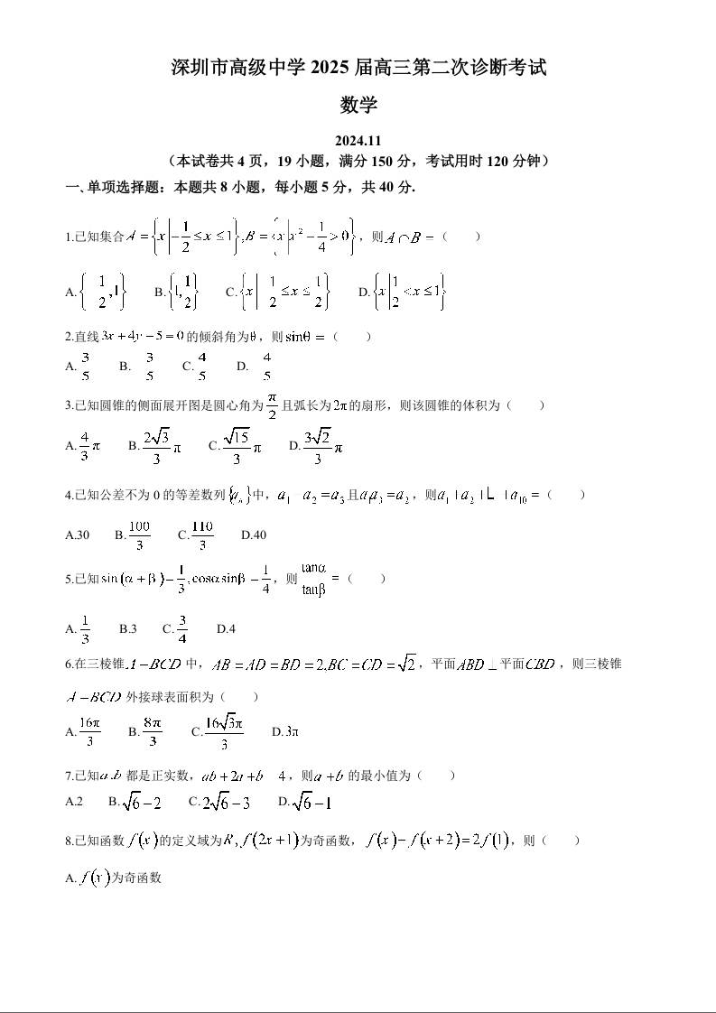 广东省深圳市高级中学2025届高三上学期第二次诊断考试数学含答案