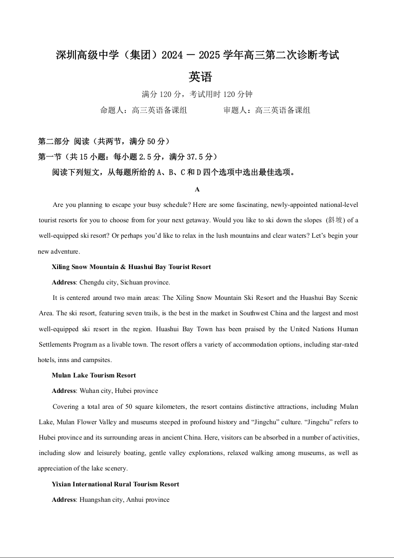 广东省深圳市高级中学2025届高三上学期第二次诊断考试英语