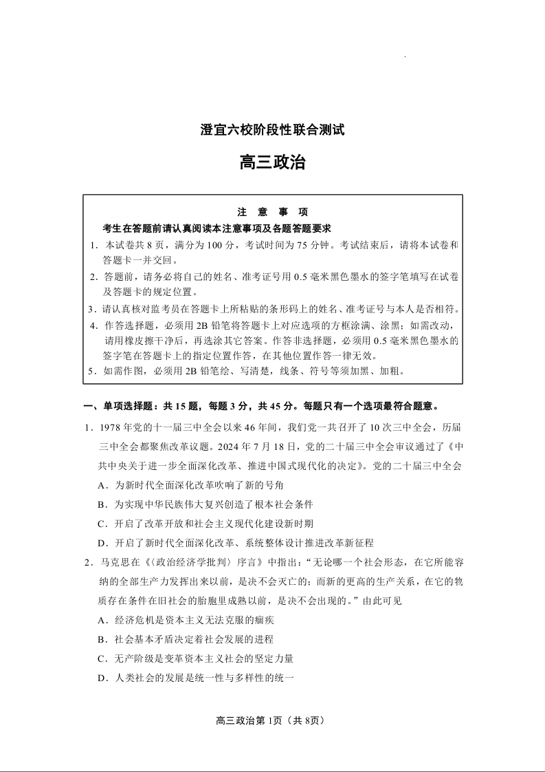 江苏省无锡市澄宜六校2025届高三上学期12月联考政治