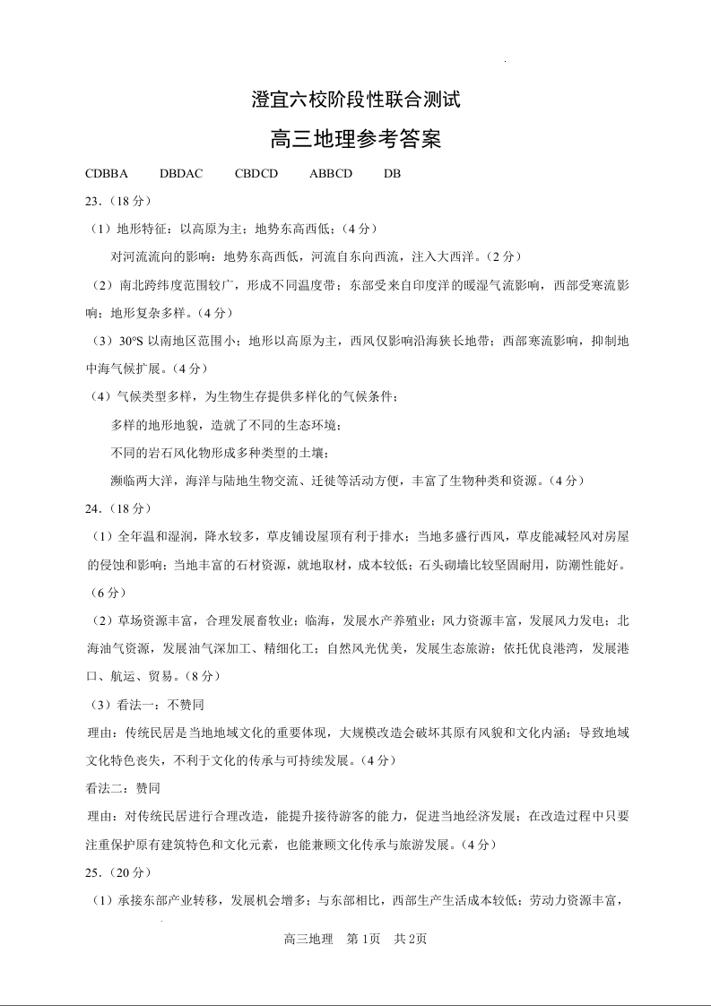 江苏省无锡市澄宜六校2025届高三上学期12月联考地理答案