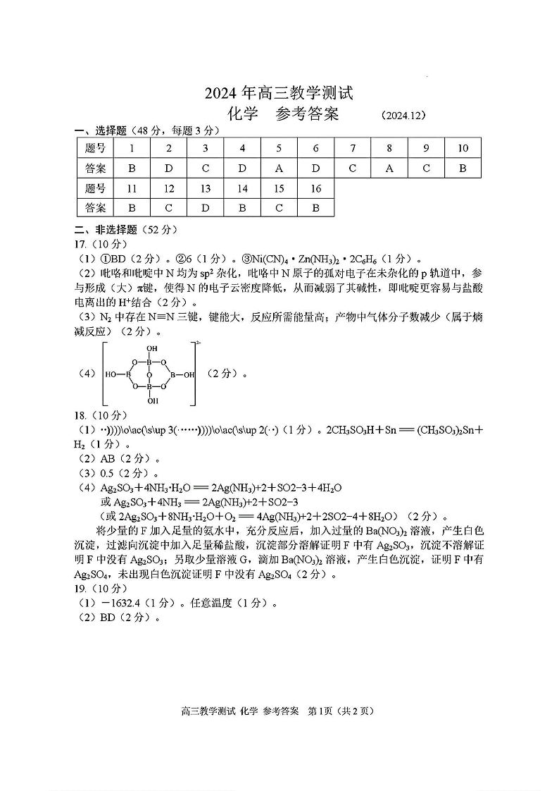 浙江省嘉兴市2025届高三上学期12月教学测试(一模)化学答案