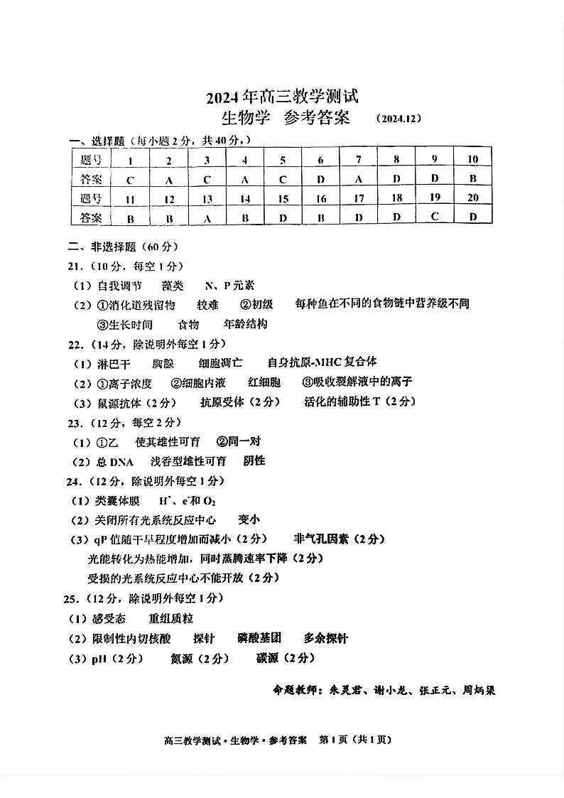 浙江省嘉兴市2025届高三上学期12月教学测试(一模)生物答案
