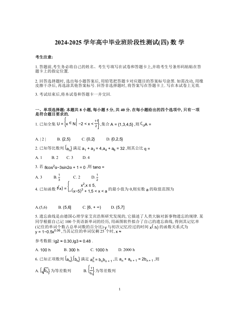 河南省天一大联考2025届高中毕业班阶段性测试(四)数学