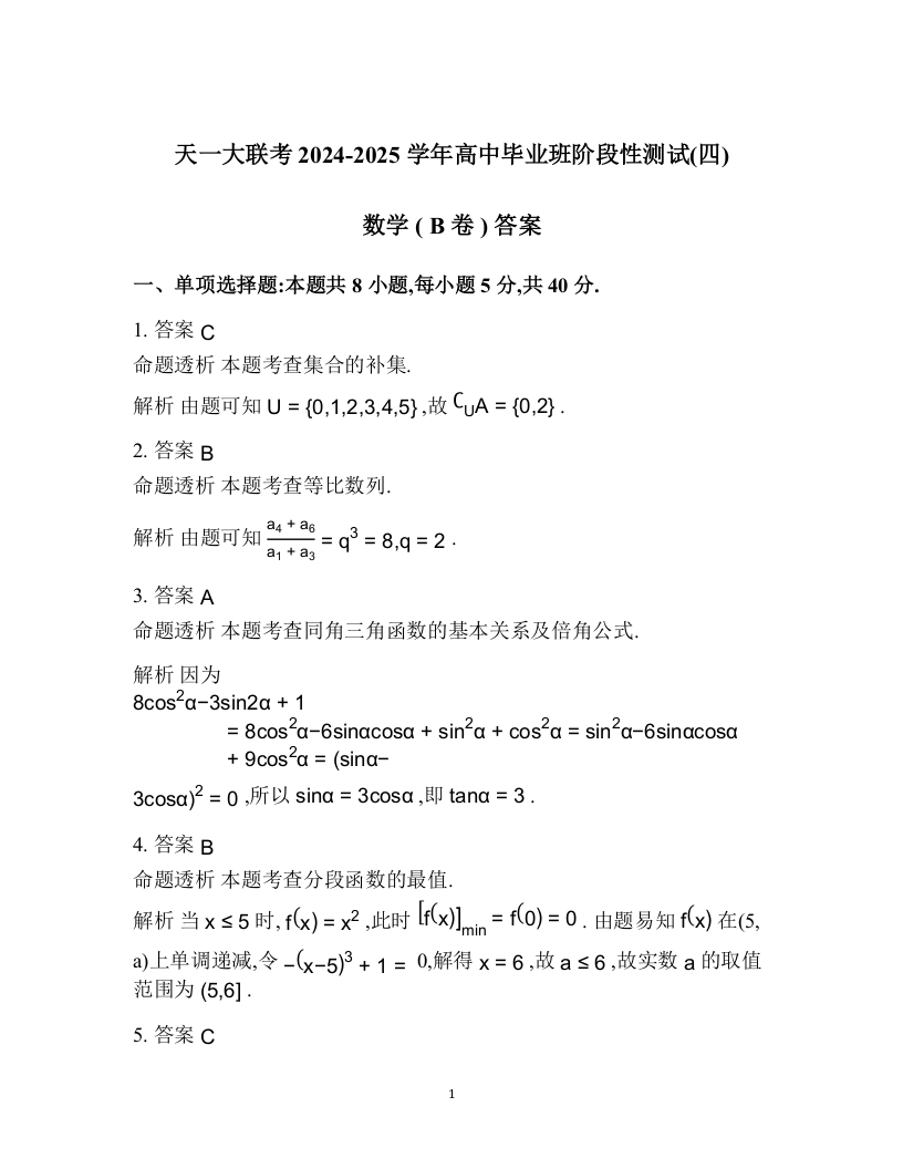 河南省天一大联考2025届高中毕业班阶段性测试(四)数学答案