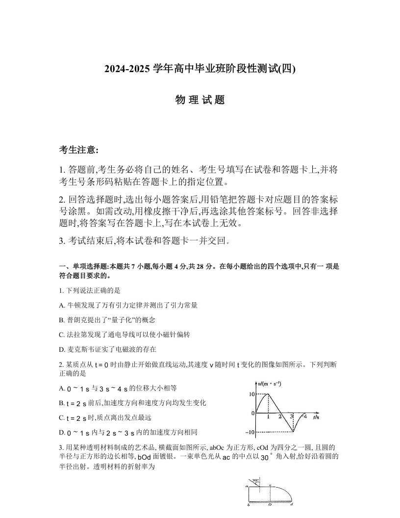 河南省天一大联考2025届高中毕业班阶段性测试(四)物理