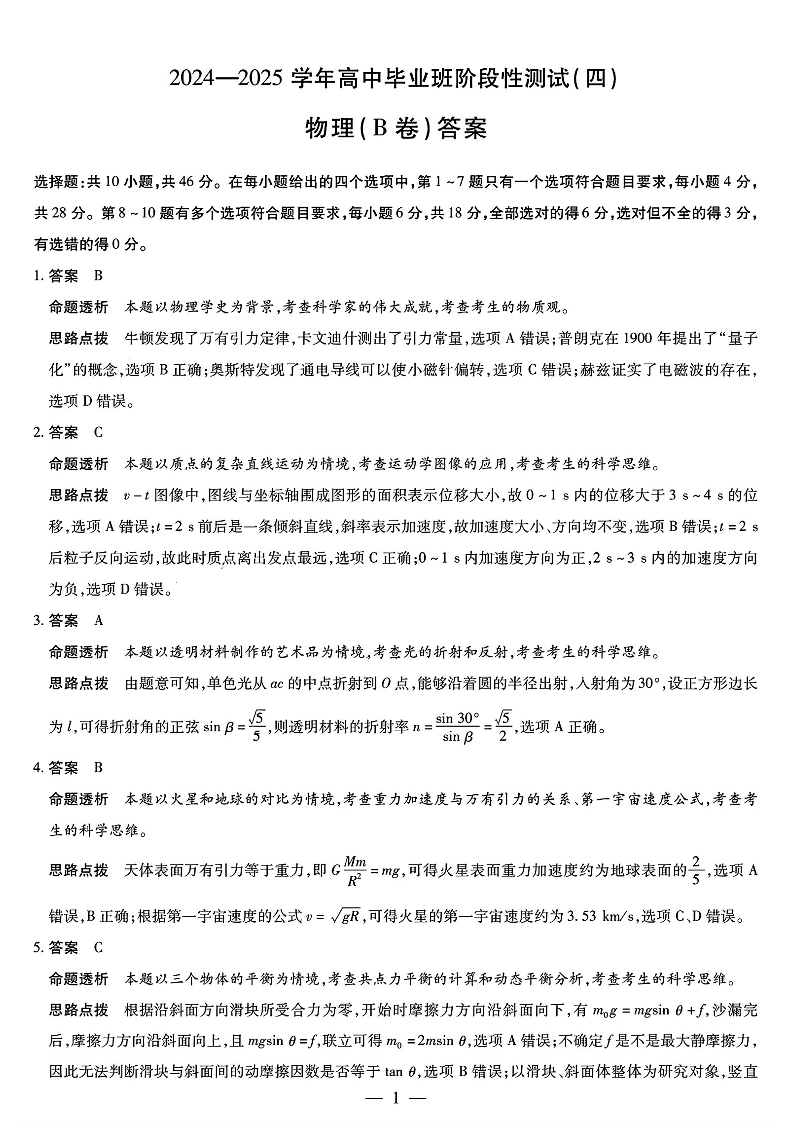 河南省天一大联考2025届高中毕业班阶段性测试(四)物理答案