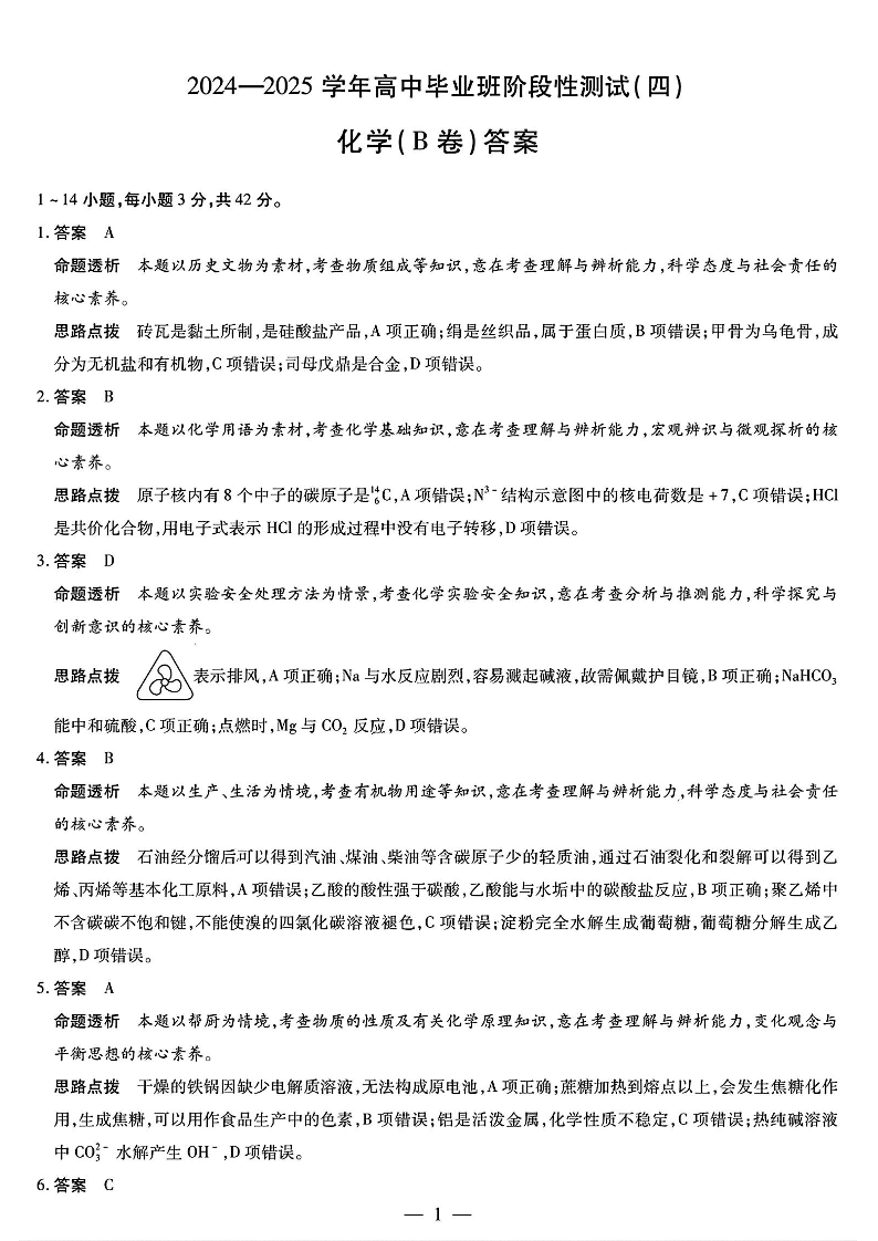河南省天一大联考2025届高中毕业班阶段性测试(四)化学答案