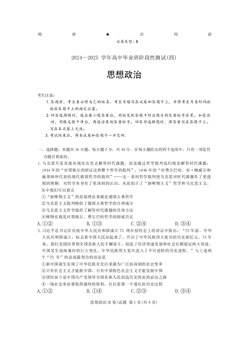 河南省天一大联考2025届高中毕业班阶段性测试(四)政治
