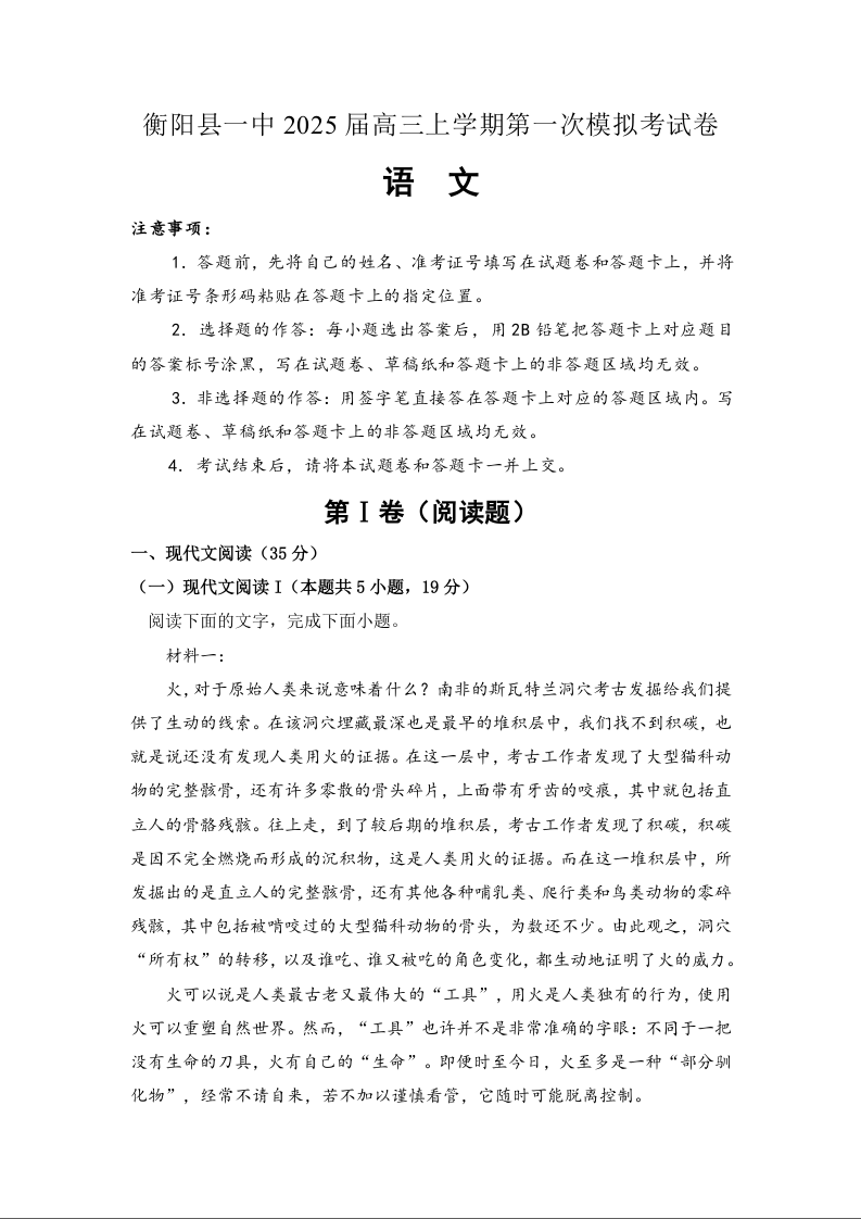 湖南省衡阳市衡阳县一中2025届高三上学期第一次模拟语文Word稿含答案