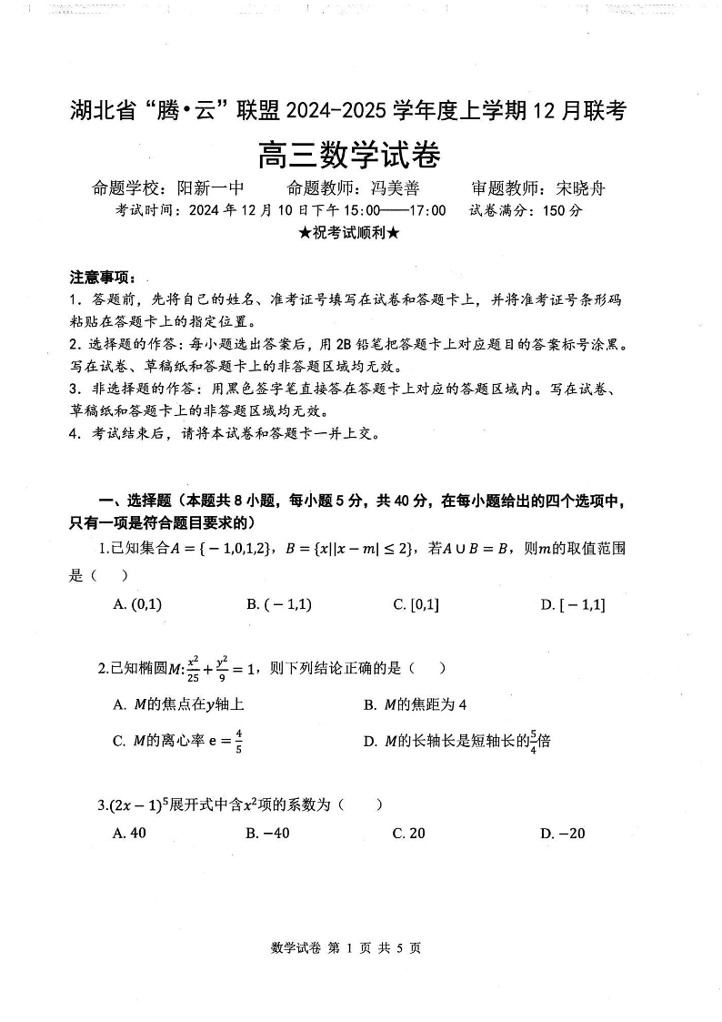 湖北省腾云联盟2025届高三上学期12月联考数学