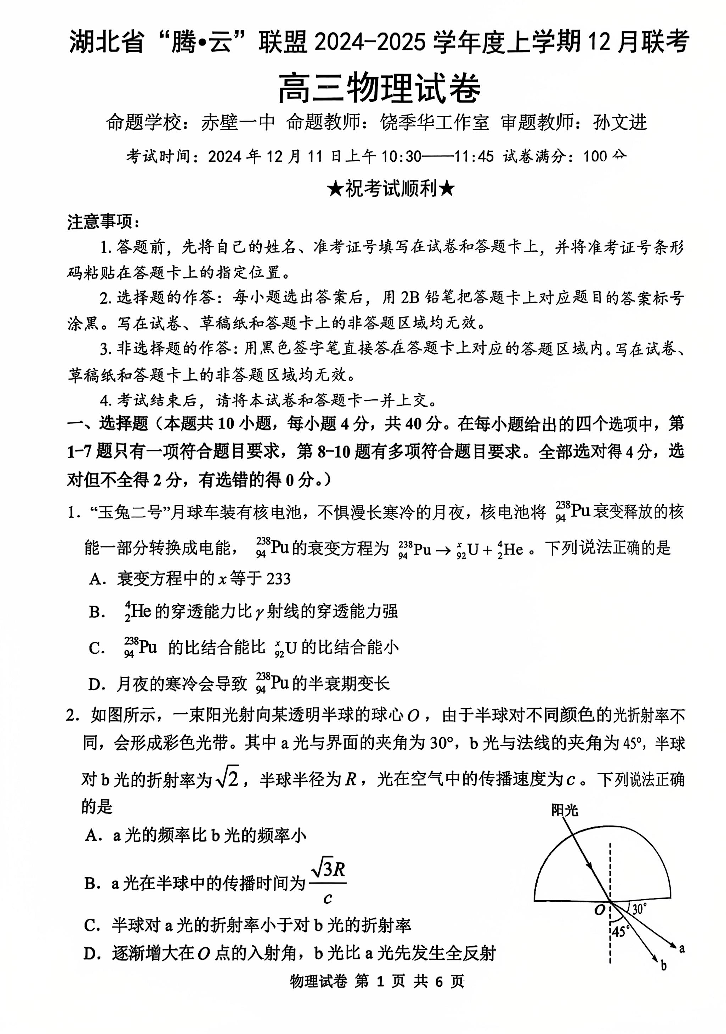 湖北省腾云联盟2025届高三上学期12月联考物理