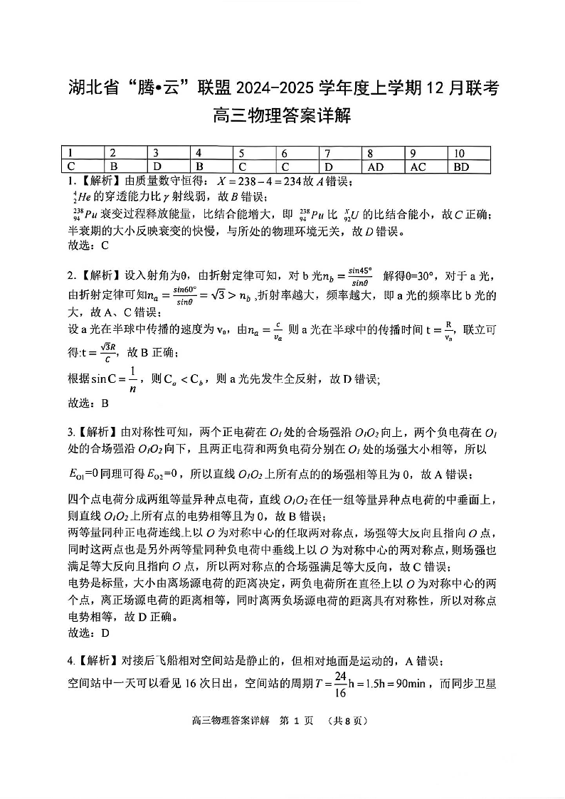 湖北省腾云联盟2025届高三上学期12月联考物理答案