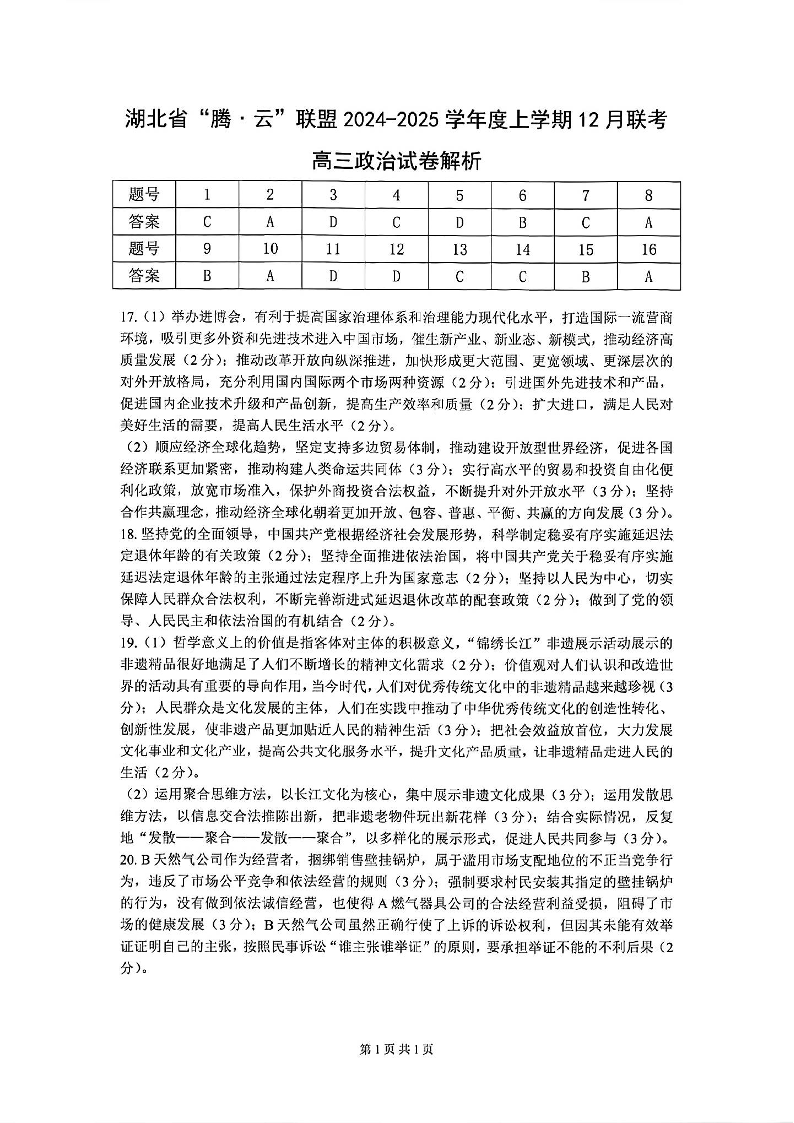 湖北省腾云联盟2025届高三上学期12月联考政治答案
