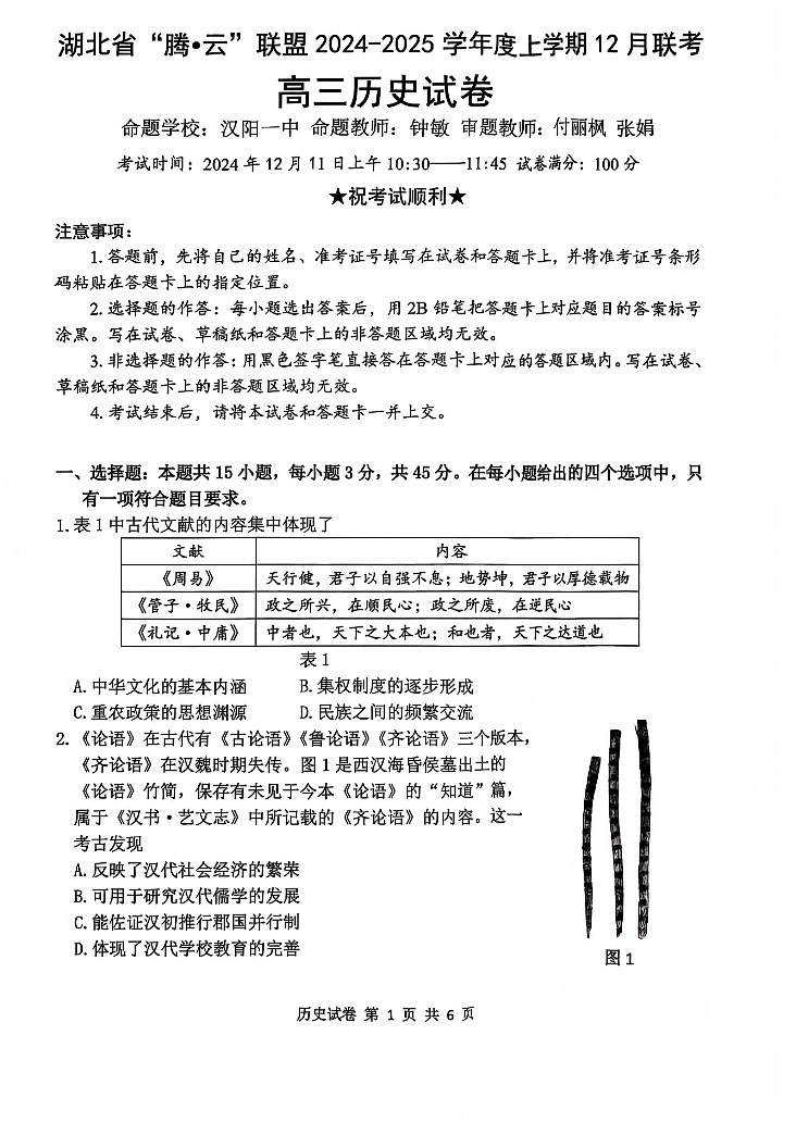 湖北省腾云联盟2025届高三上学期12月联考历史