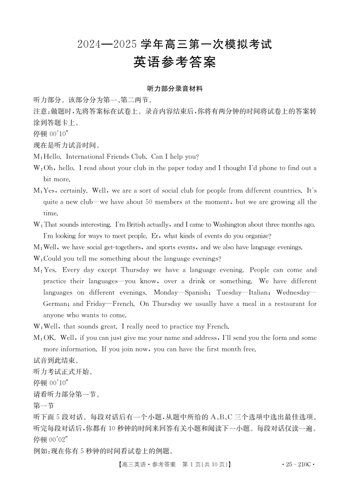 河南省新乡市2025届高三上学期第一次模拟考试英语答案