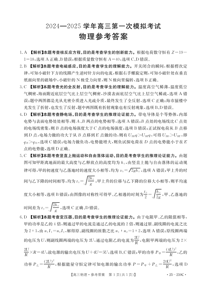 河南省新乡市2025届高三上学期第一次模拟考试物理答案