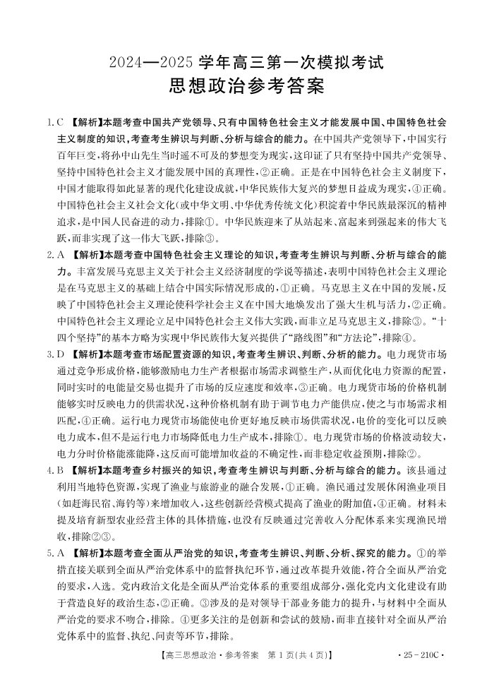 河南省新乡市2025届高三上学期第一次模拟考试政治答案