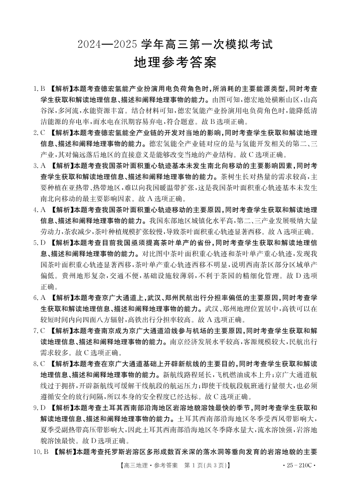河南省新乡市2025届高三上学期第一次模拟考试地理答案