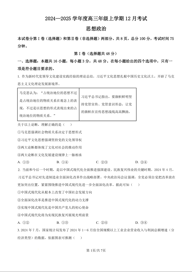 河北省衡水市冀州中学2025届高三上学期12月月考政治(原卷版)