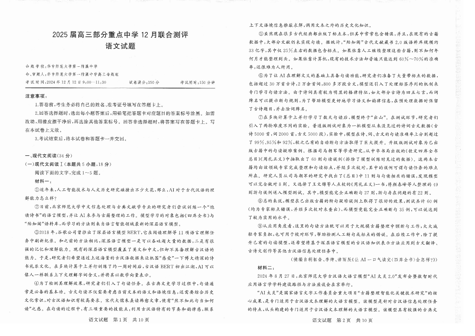 T8八省八校联考2025届高三部分重点中学12月联合测评语文