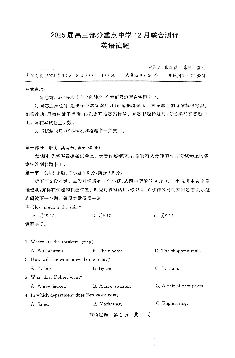 T8八省八校联考2025届高三部分重点中学12月联合测评英语