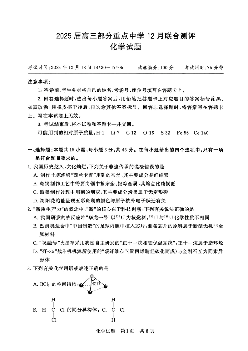T8八省八校联考2025届高三部分重点中学12月联合测评化学PDF含答案
