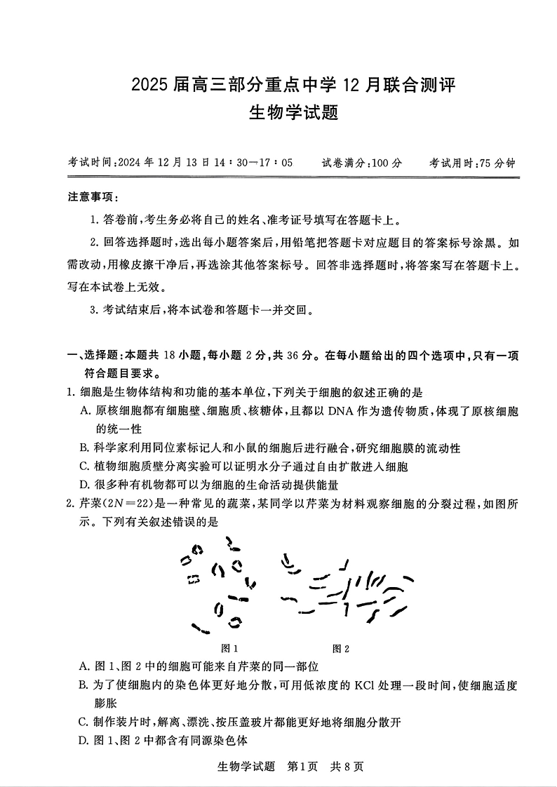 T8八省八校联考2025届高三部分重点中学12月联合测评生物PDF含答案