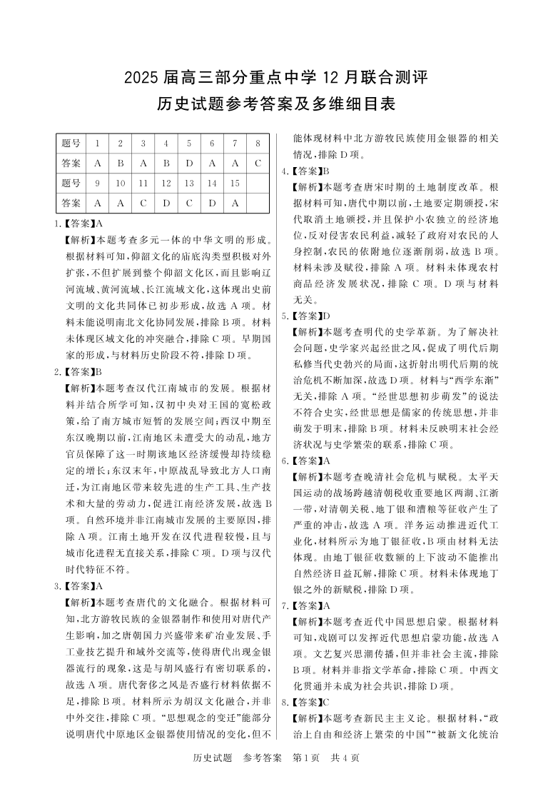 T8八省八校联考2025届高三部分重点中学12月联合测评历史答案