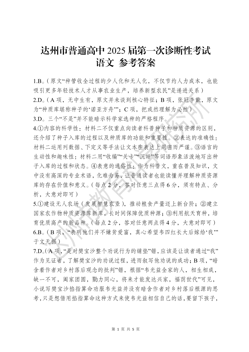 四川省达州市普通高中 2025 届第一次诊断性测试语文答案