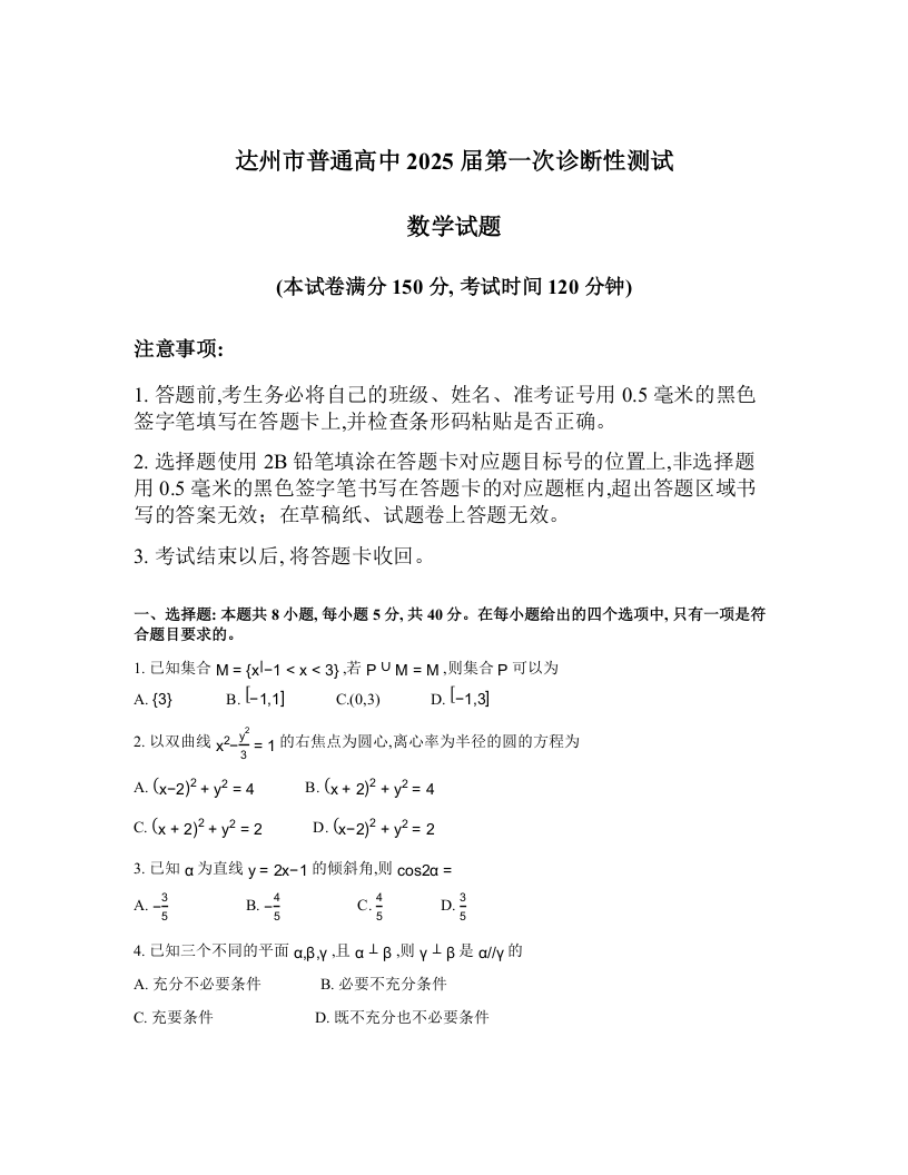 四川省达州市普通高中 2025 届第一次诊断性测试数学