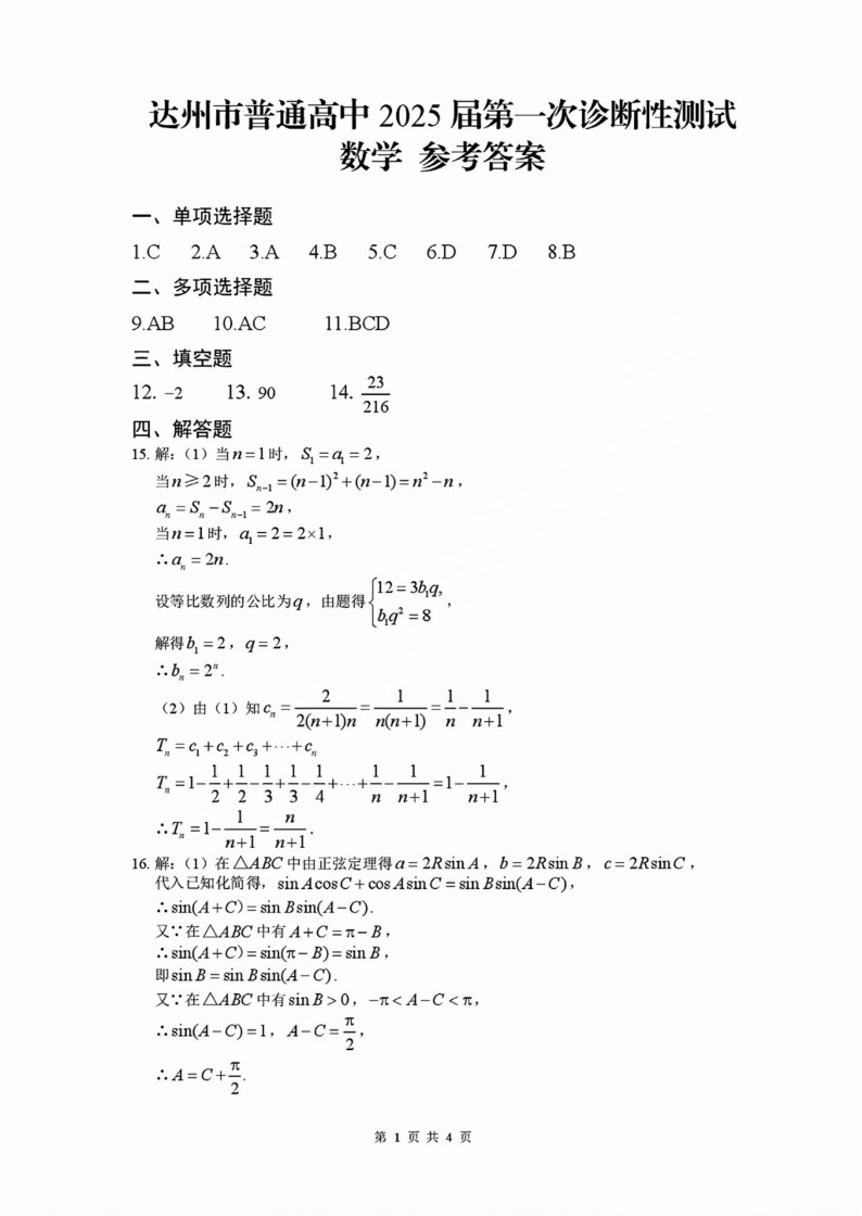 四川省达州市普通高中 2025 届第一次诊断性测试数学答案
