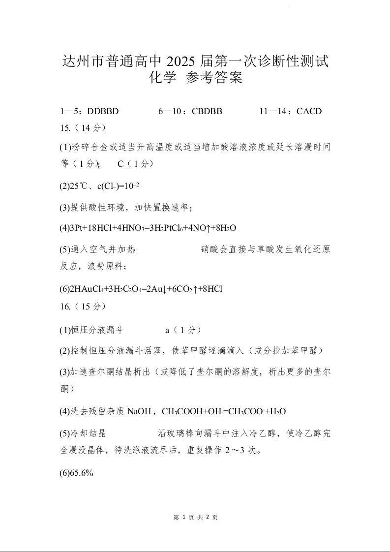 四川省达州市普通高中 2025 届第一次诊断性测试化学答案