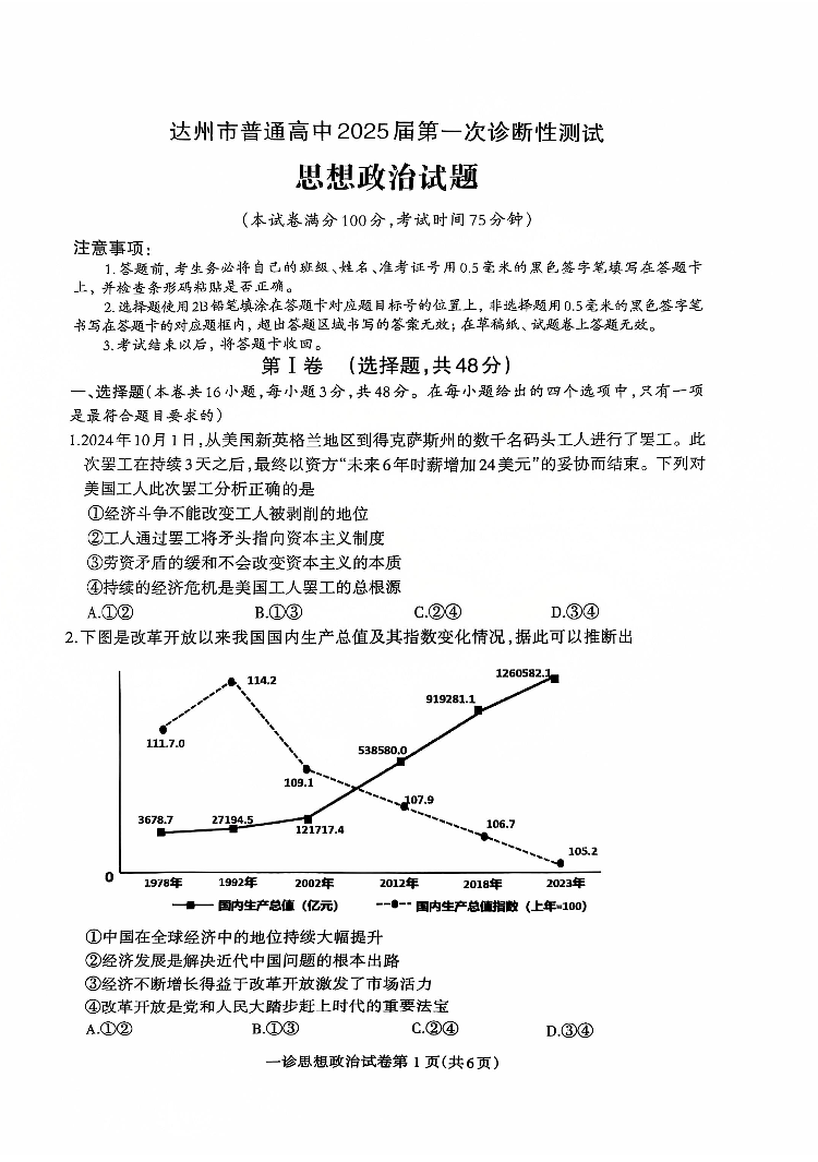 四川省达州市普通高中 2025 届第一次诊断性测试政治PDF版含答案