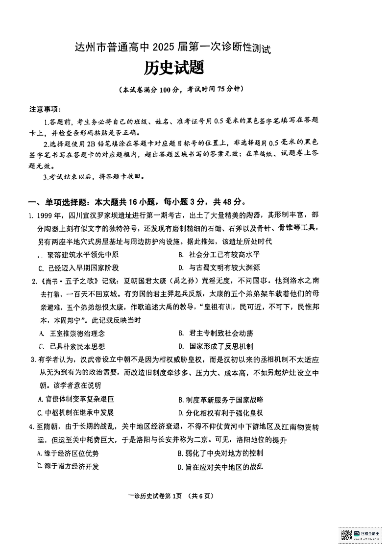 四川省达州市普通高中 2025 届第一次诊断性测试历史